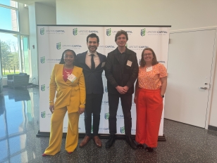 From left: Student entrepreneurs Jada Ivey and Jonah Christakis, student research assistant Jamison Pomroy, and BEP coordinator Olivia Harbol attend NYBPC 2024 in Albany.