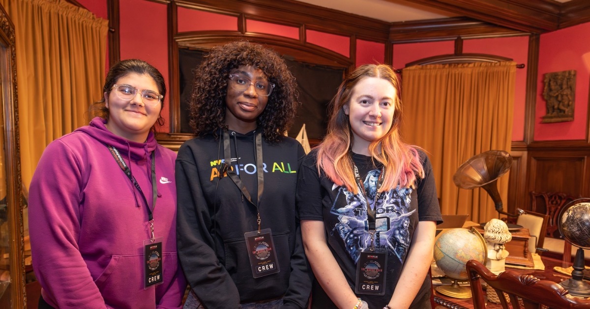 Each student was assigned a role—or roles—that determined their responsibilities throughout production. As a business major, Ajayi was a natural fit for student marketing director, but she also served as a production assistant on set, which meant providing support to almost every department, from art design to electric to craft services.